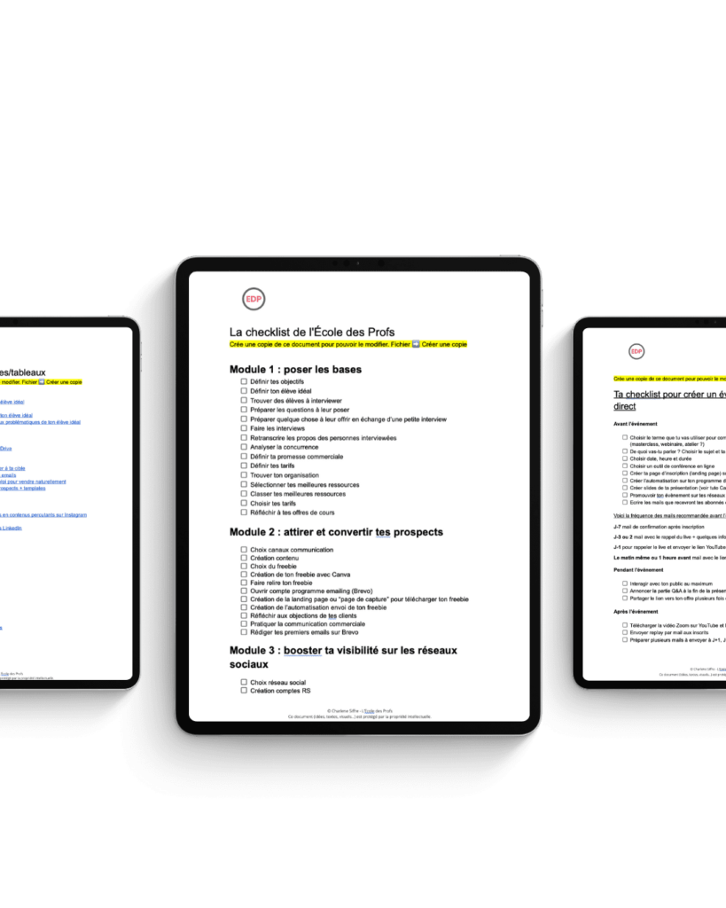 À la fin du paiement de l’Ecole des Profs tu reçois automatiquement par email ton accès à la plateforme de cours (PODIA) où tu trouveras tous les cours, ainsi que les vidéos tutoriels et les bonus qui sont accessibles directement et à vie !