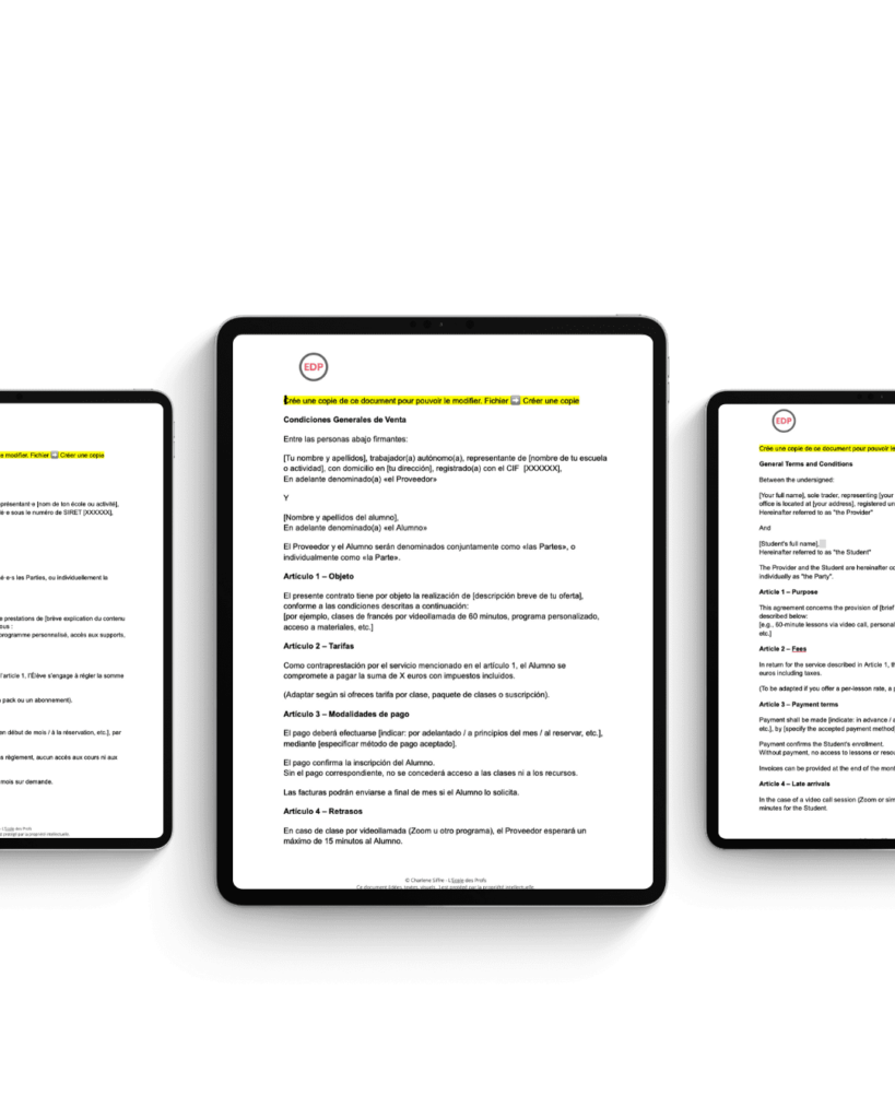 Tes Conditions Générales de Vente en français, anglais et espagnol.